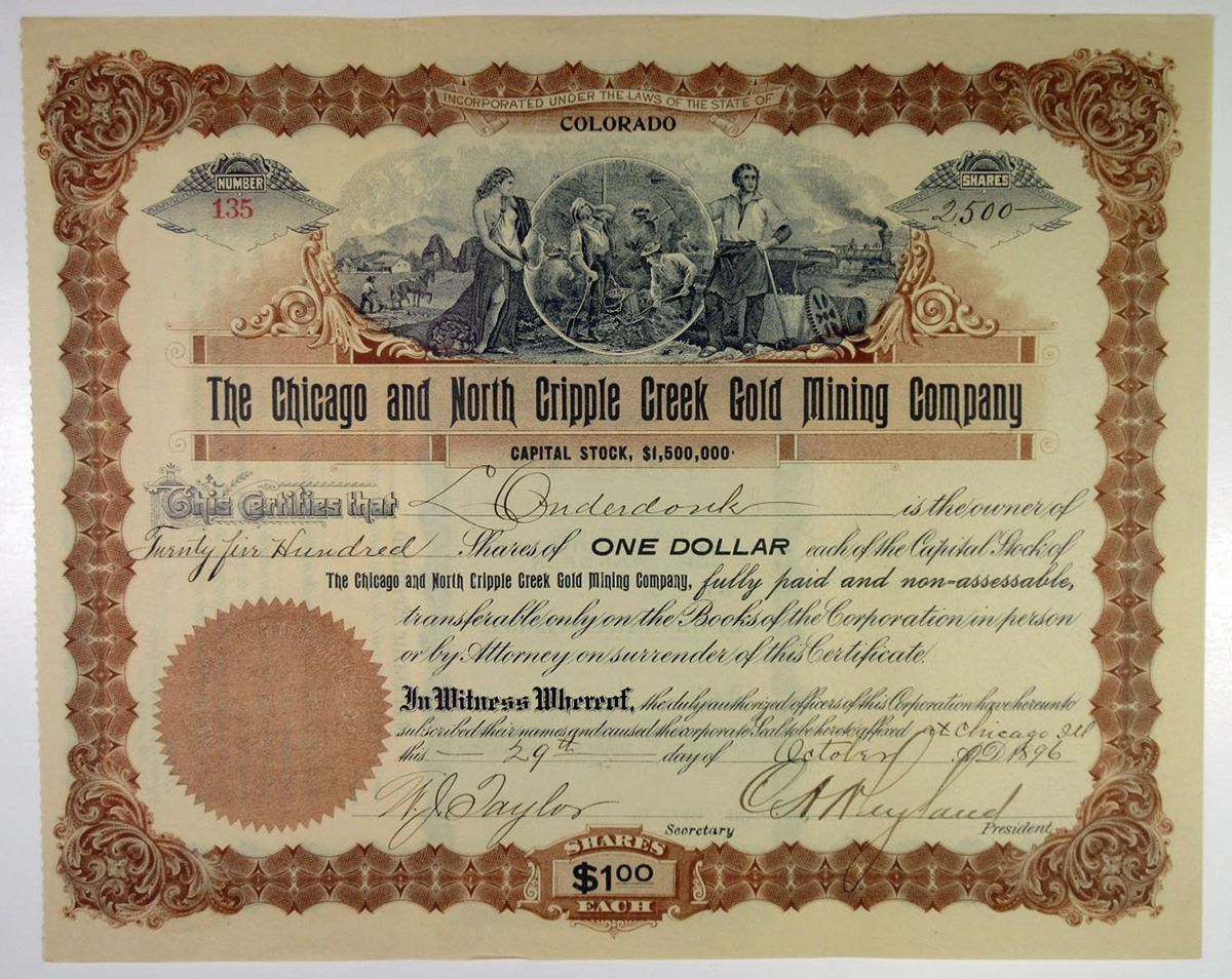 Cripple Creek, Colorado, 1896. 2,500 Shares I/U Capital Stock Certificate #135, Black text with brown border, Men at work in mine flanked by allegorical figures at top. Fine condition. The Cripple Creek district in Colorado was a popular area of gold mining in the late 1800s to the early 1900s.