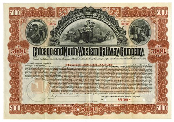 Illinois, Michigan, Wisconsin. $5000 Specimen 3 1/2% Gold Registered Bond, Black print on brown border and under tint on horizontal format, Allegorical woman reclining at top by docks with smaller images of porters with luggage at each corner, Specimen overprints and POC's, VF-XF condition with minor splitting at bottom fold lines, ABNC.