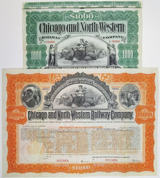 Illinois1897. 2 pieces: $10,000 Specimen 3.5% Registered General Mortgage Gold Bond in orange; and $1000 Specimen 3.5% General Mortgage Gold Coupon Bond in green. Both have red specimen overprints, 00000 serial numbers, and POCs. Fine condition with some fragile fold lines, ABNC. Both are only listed in specimen format in Cox, Rare. (2)