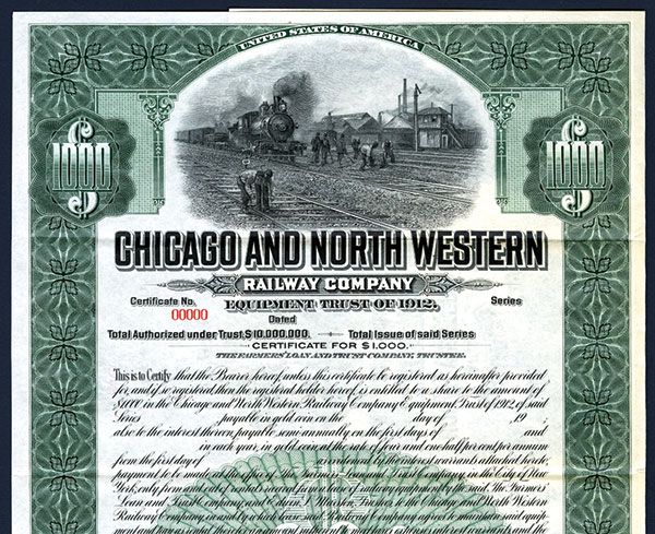 Illinois, 1913, $1000, 4 1/2% Equipment Trust, Black on green border and underprint, Moving locomotive in railway yards with men working top center, VF-XF condition, ABNC. Listed railroad but unlisted bond in Cox.