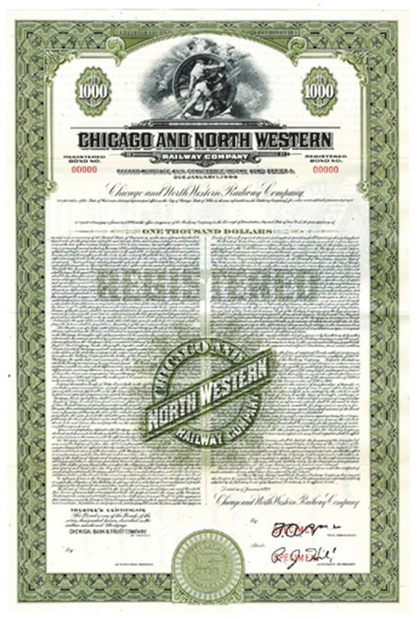Wisconsin. $1000 Specimen 4 1/2% Series A Registered 2nd Mortgage Convertible Income Bond, Black print on green border and under tint, Allegorical figure with wheel at top, Specimen overprints and POC's, VF-XF condition, ABNC.
