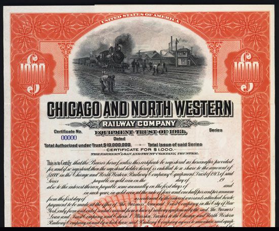 Illinois, 1913, $1000, 4 1/2% Equipment Trust, Black on red border and underprint, Moving locomotive in railway yards with men working top center, VF-XF condition, ABNC. Listed railroad and bond in Cox.