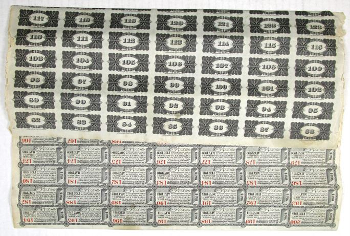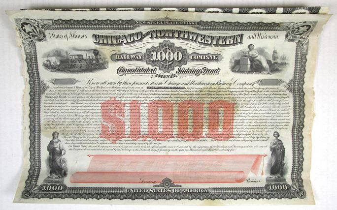 Illinois & Wisconsin, 1875. $1000 Specimen 7% Consolidated Sinking Fund Coupon Bond, CHI-502-B-20b, Black print with black border and red undertint, Vignettes at each corner 3 are of allegorical figures and 1 is of a locomotive, Fine to VF condition with rough to left side margin, ABNC.