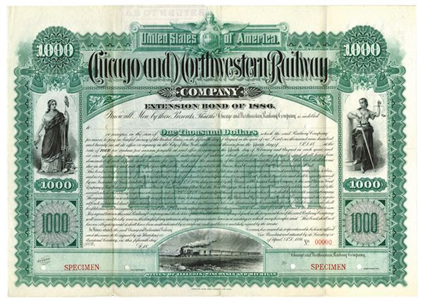Illinois, Wisconsin & Michigan. $1000 Specimen 4% Extension Bond, Black print on large ornate green border and under tint in horizontal format, Multiple images on certificate including locomotive at bottom , Specimen overprints and POC's, Fine condition with splitting along fold lines condition, ABNC.