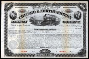 Wisconsin, Michigan and Illinois. 1879, $1,000. 6% Sinking Fund Bond. Black border w/ locomotive over bridge in middle with young women writing and spinning yarn on left and right. ABNC. Specimen, VF. Scarce and attractive bond.
