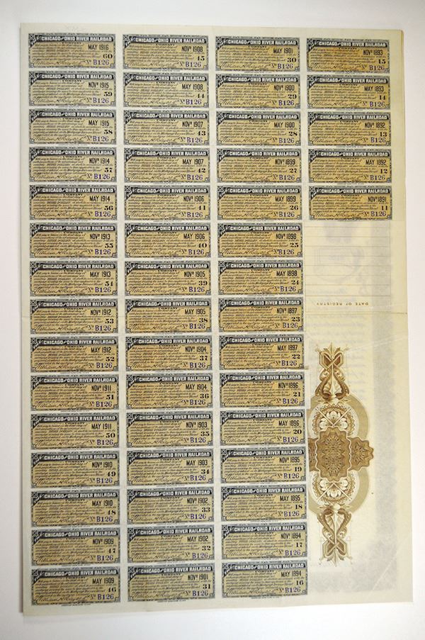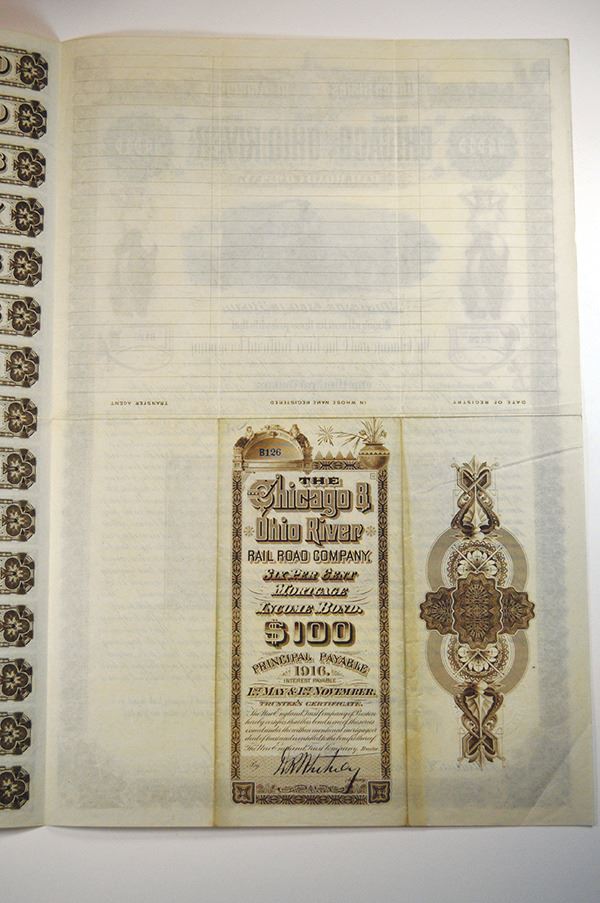 Illinois, $100 I/U, 6% Mortgage Income coupon Bond, Train over bridge R-L flanked by standing allegorical women, small train on bottom under ornate title, VF, S/N B126, ABNC. Unlisted as a bond in Cox and only one variety and design of stock certificate known. Lovely and rare.