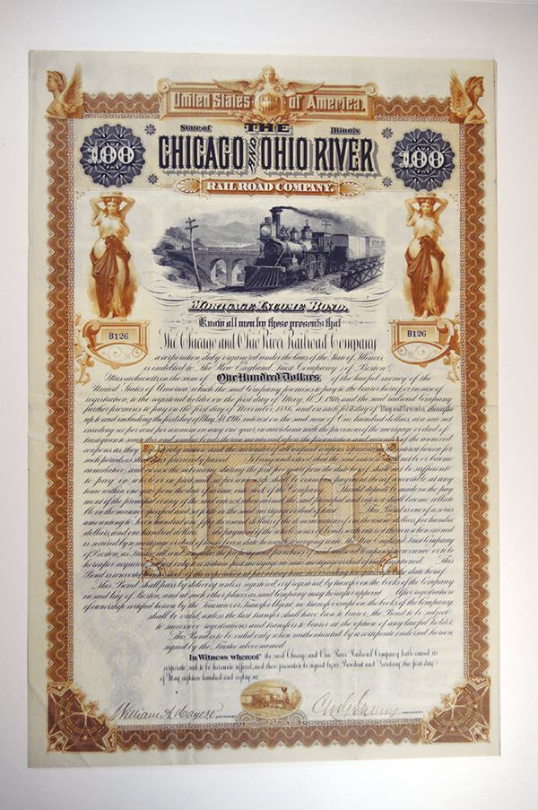 Illinois, $100 I/U, 6% Mortgage Income coupon Bond, Train over bridge R-L flanked by standing allegorical women, small train on bottom under ornate title, VF, S/N B126, ABNC. Unlisted as a bond in Cox and only one variety and design of stock certificate known. Lovely and rare.