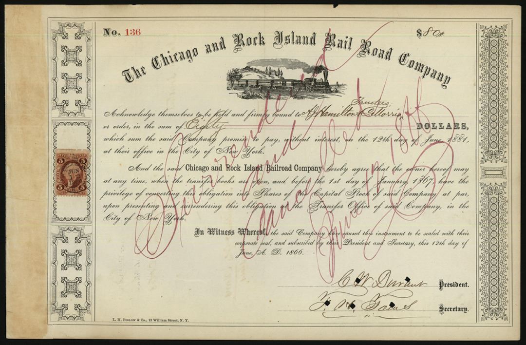 Illinois. 1866, $80, I/C, Interest Free Bond Convertible to Shares, Horizontal format, Black print with vignette of locomotive moving l-r top center, VF condition with pink ink cancellation, Thomas Clark Durant (February 6, 1820 Ð October 5, 1885) was an American physician, businessman, and financier. He was vice-president of the Union Pacific Railroad (UP) in 1869 when it met with the Central Pacific railroad at Promontory Summit in Utah Territory. He created the financial structure that led to the CrŽdit Mobilier scandal. During the Civil War, Durant made a fortune smuggling contraband cotton from the Confederate States with the help of General Grenville M. Dodge.[6] When the war ended in 1865, the Union Pacific put extra labor on. It completed nearly two thirds of the transcontinental route. Durant employed Dodge as the chief engineer along the Platte River route. The certificate is also signed by A. J. Hamilton, as trustee, who was also the Governor of Texas until 1866 but it deserves further research. L.H. Biglow & Co.