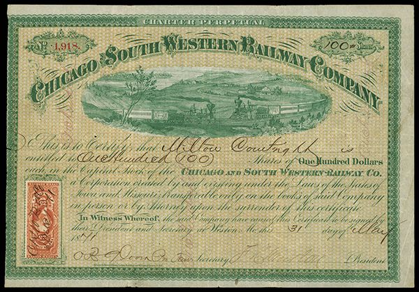 Chicago and South Western Railway Co. 1871 I/U Stock Certificate. Weston, MO. 1871. 100 Shs, Issued and uncancelled. Two locomotives traveling toward each other on curve. Green borders and vignette with light orange undertint. U.S. 25cts, 1st issue revenue stamp on lower left, VF condition with margin on left barely cut into but not affecting appearance. Scarce and attractive railroad certificate. This is the only type or variety known on this railroad. Scarce and very attractive.
