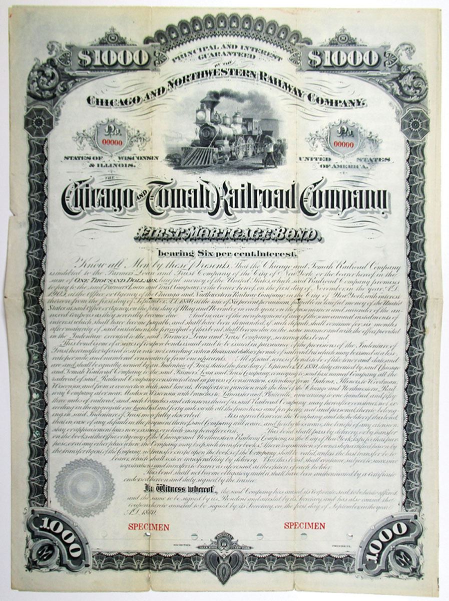 WI & IL, 1880. $1000 Specimen 6% First Mortgage Coupon Bond, Black text with black border, Train passing on tracks with passengers waiting nearby at top center. Red specimen overprints, 00000 serial numbers, and POCs. Top title states "Principal and Interest Guaranteed by the Chicago and Northwestern Railway Co.", Fine to VF condition with reinforced splitting along fold lines, ABNC. Unlisted bond in Cox, Very Rare specimen. This was the only example found in the ABN archives in 2002.