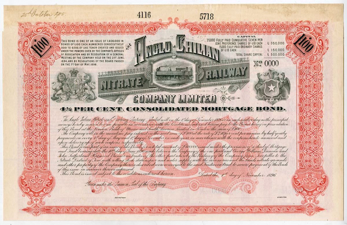 England & Chile. 100 Pounds Specimen 4 1/2% Consolidated Mortgage Coupon Bond, Black print on ornate red border and under tint on horizontal format, Company title at center flanked by seals of England and Chile, VF-XF condition with toning around edges, Bradbury, Wilkinson & Co.