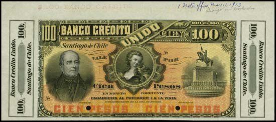 Santiago, Chile. ND (ca. 1880-1890's). 100 Pesos. P-S211 Unlisted. Specimen. Red specimen overprint, POC and "00000" serial numbers. Counterfoils on left and right side of note. Large uncut sheet margins on bottom and bothsides. Choice Unc. Extremely rare and attractive note.