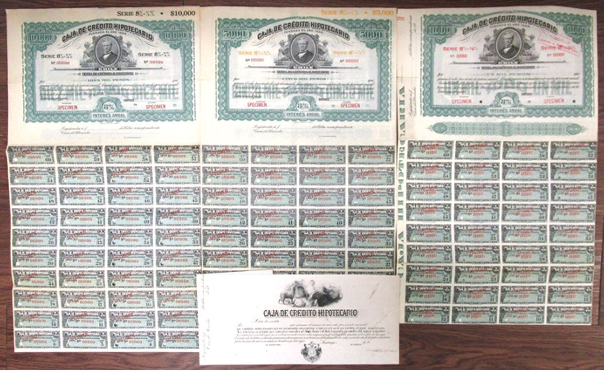 Santiago, Chile, ND (1900s). Lot of 4, Includes: 1000 Pesos, 5000 Pesos, and 10,000 Pesos Specimen 8% Coupon Bonds, All have black printing with same vignette at top of notable gentleman under title, Specimen overprints and POCs, Lot also includes Progress Proof Bond for Caja de Credito - shows allegorical woman reclining beside Sheep. All range from VF to XF+ condition. (4). Sold "AS IS" no returns accepted.