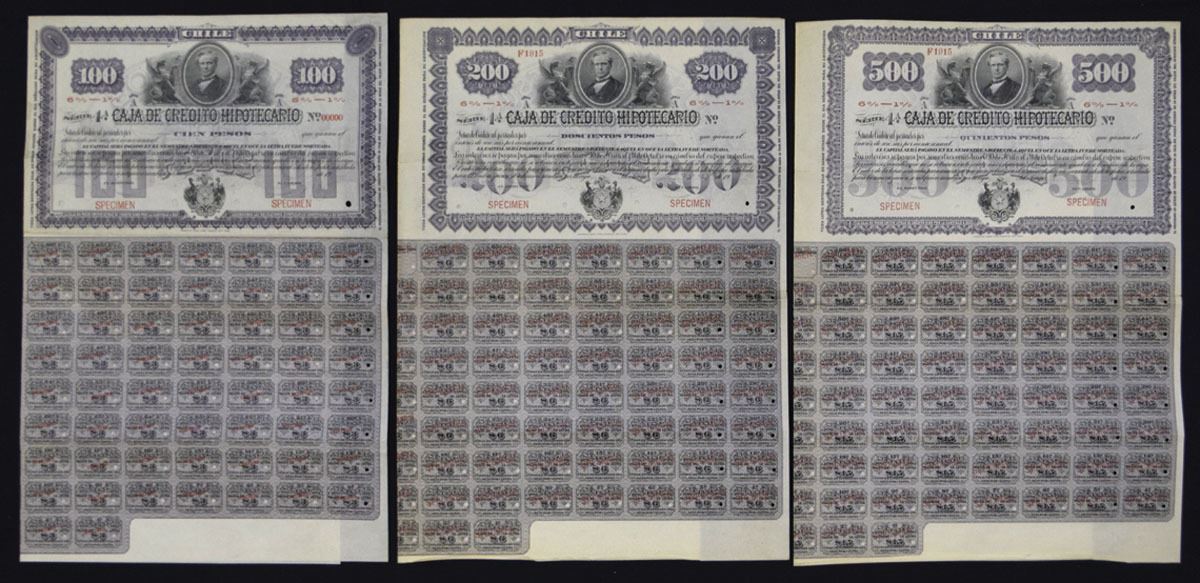 Santiago, Chile, ND (1900-30s), Specimen Bond Trio, Includes: 100 Pesos 6%-1% Serie A-4A Coupon Bond; 200 Pesos 6%-1% Serie A-4A Coupon Bond; 500 Pesos 6%-1% Serie A-4A Coupon Bond. All have black print with purple borders, Portrait of man at top center flanked by Griffins and Arms of Chile at bottom, Specimen overprints and POCs, are in Fine to VF+ condition, and printed by ABNC. (3). Sold "AS IS" no returns accepted.