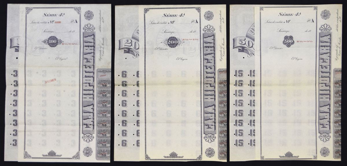 Santiago, Chile, ND (1900-30s), Specimen Bond Trio, Includes: 100 Pesos 6%-1% Serie A-4A Coupon Bond; 200 Pesos 6%-1% Serie A-4A Coupon Bond; 500 Pesos 6%-1% Serie A-4A Coupon Bond. All have black print with purple borders, Portrait of man at top center flanked by Griffins and Arms of Chile at bottom, Specimen overprints and POCs, are in Fine to VF+ condition, and printed by ABNC. (3). Sold "AS IS" no returns accepted.