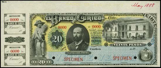 Curico, Chile. 18--, (ca.1882). 20 Pesos. P-S220s. Specimen. Red specimen overprint, POC and "00000" serial numbers. Counterfoils on left side of note. Large uncut sheet margins on top with "May 1888" date written in red ontop large margin. AU to Unc. Condition with light internal bend visible on lower right back bottom margin only. Rare and attractive note. ABNC.