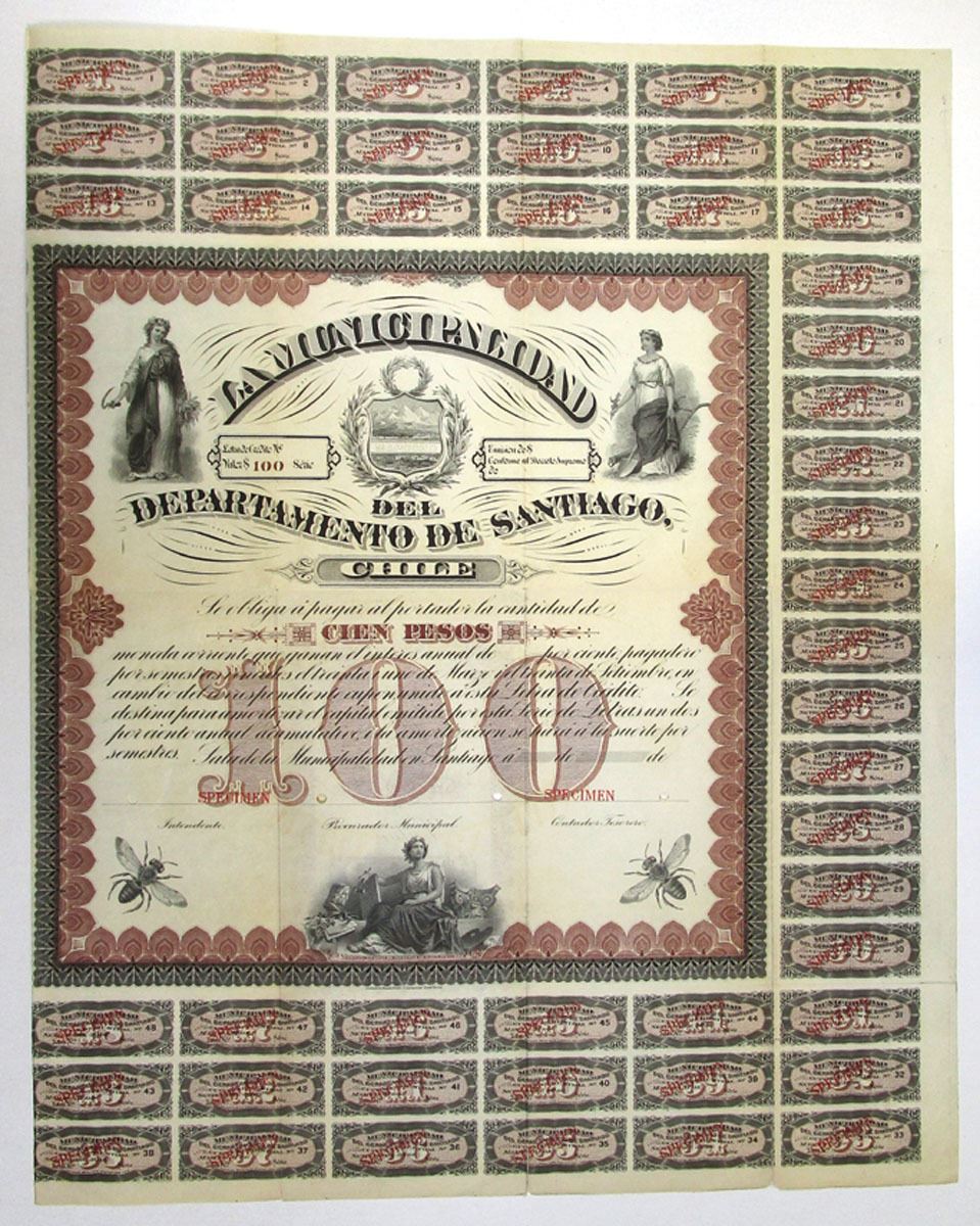 Santiago, Chile, ND (1880 to 1900s). 1000 Pesos, Specimen %Odd Coupon Bond, Black print with brown border and underprint in Spanish, Allegorical women at top corners and bottom center with bees at bottom corners and crest at center embedded in title, Specimen overprints and POCs, VF to AU condition, NBNC.