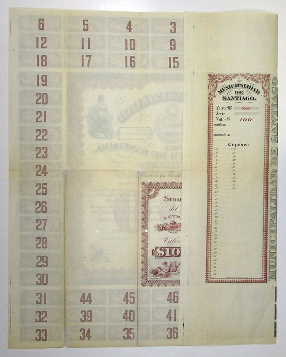 Santiago, Chile, ND (1880 to 1900s). 1000 Pesos, Specimen %Odd Coupon Bond, Black print with brown border and underprint in Spanish, Allegorical women at top corners and bottom center with bees at bottom corners and crest at center embedded in title, Specimen overprints and POCs, VF to AU condition, NBNC.