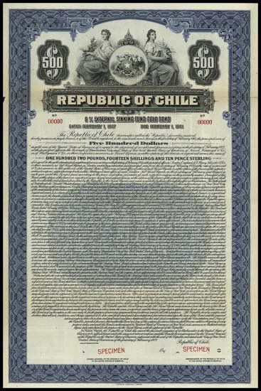 Specimen bond. 1927. 6% External Sinking Fund Gold Bond. $ 500 or 102 pounds, 14 Shillings and 10 Pence. Blue border and undertint. Allegorical women flank Arms of Chile. Red SPECIMEN overprint and POC. Coupons attached. VFCondition with small piece missing on upper left fold margin. ABNC.