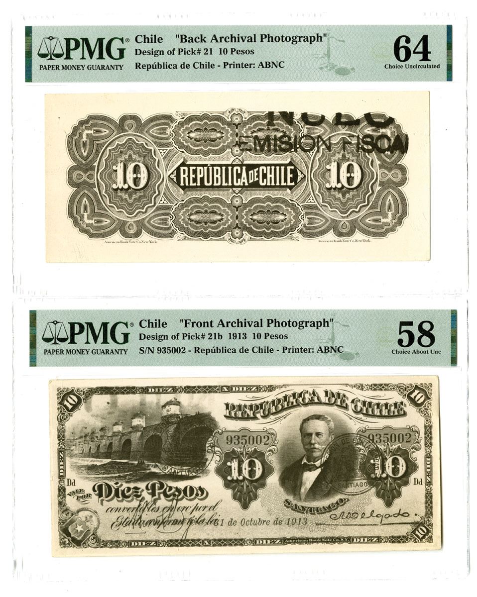 Santiago, Chile, 1913. 10 Peso, P-21bp, Obverse and Reverse Photo Proofs, Black and White photos printed on glossy paper, Obverse has Towered bridge at left and portrait of President J. J. Perez at right, Reverse has denomination at left and right with bank name at center, Front has S/N 935002, Reverse has "Emission Fiscal" stamp over back, Both are PMG graded: Obverse is Choice About Uncirculated 58 and Reverse is Choice Uncirculated 64. ABNC. (2). These are photo proofs of the original specimen or issued notes that were used during the production process to determine if the design and text were correct and also used for approvals and their records. These were from the Thomas De La Rue production and design department., Sold "AS IS" no returns accepted.
