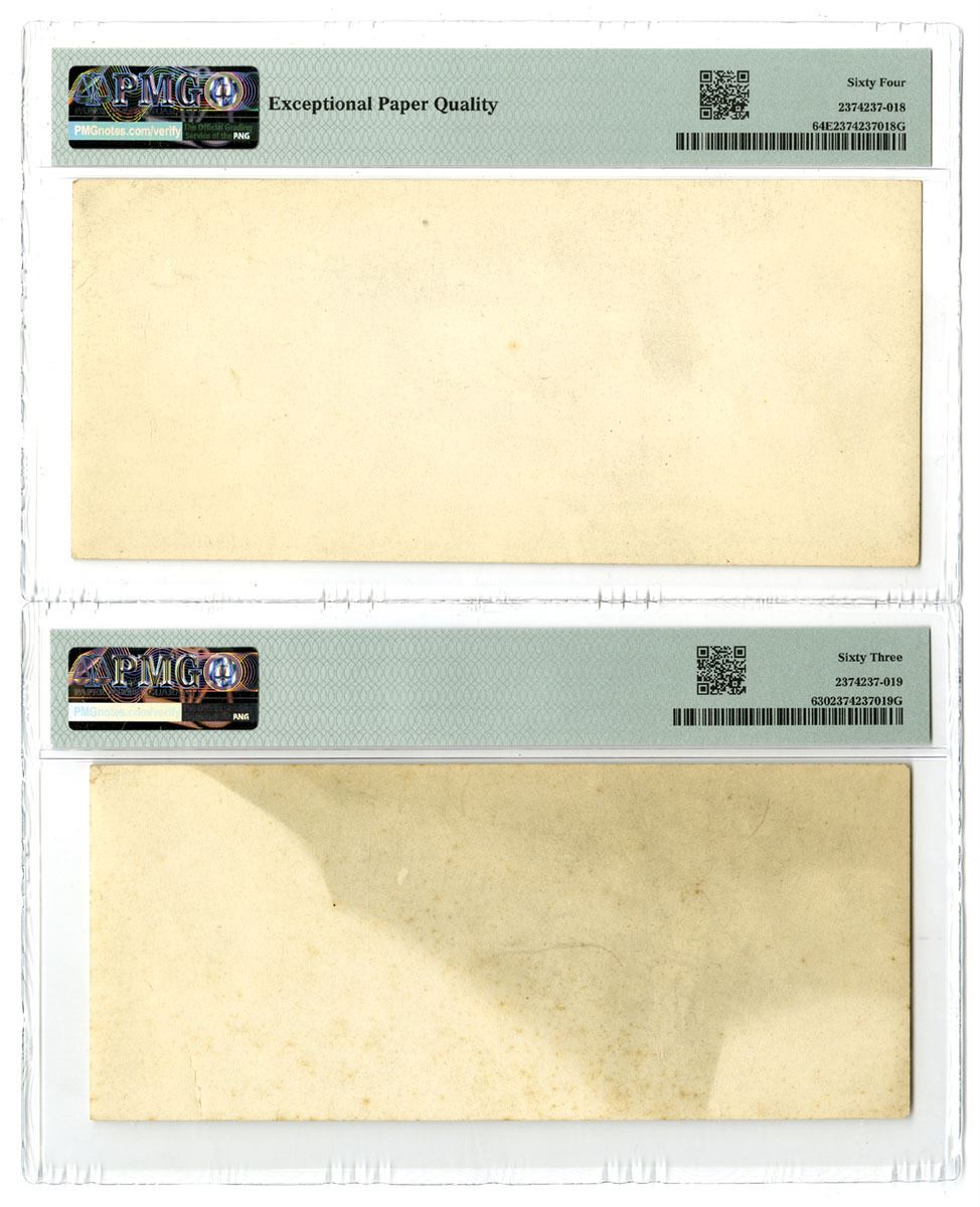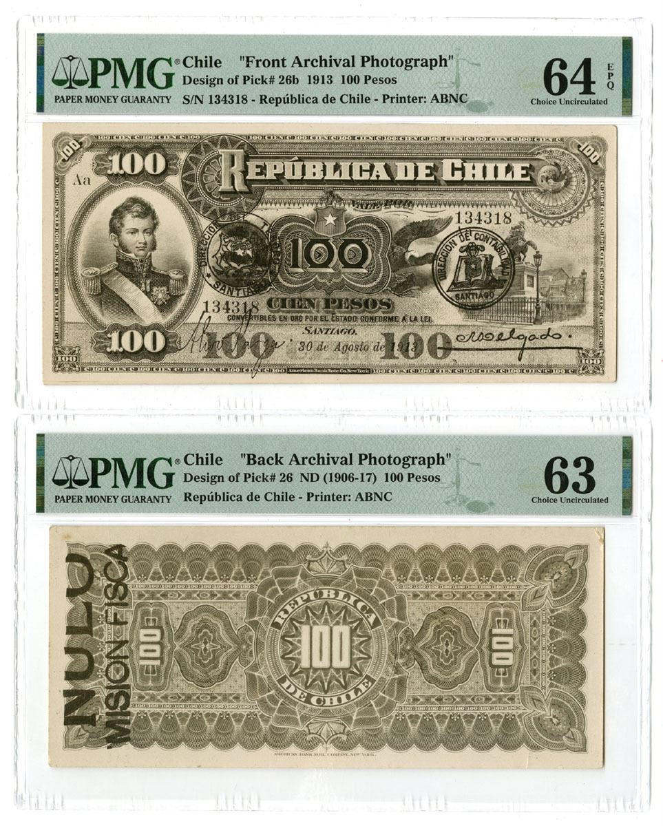 Chile, 1913. 100 Pesos, P-26bp, Obverse and Reverse Photo Proofs, Black and white photos printed on glossy paper, Obverse shows B. O'Higgins in uniform at left with a monument at right, Reverse shows guilloches with denomination at either side, Front has S/N 134318, Reverse has "Emission Fiscal" stamp over back, ABNC. Both are PMG graded: Obverse is Choice Unc 64 EPQ and Reverse is Choice Unc 63. (2). Sold "AS IS" no returns accepted.
