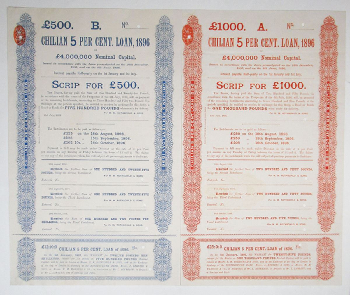 Chile, (Issued in London, England), 1896. Lot of 2 bonds, includes: £500 in blue and £1000 in red, Payable at N.M. Rothschild & Sons, Both have POC's, are in XF-AU condition, Printed by BWC.