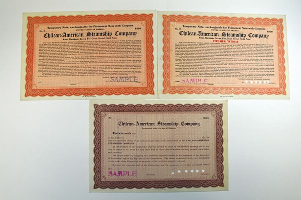 Temporary Bonds (2) and Temporary Stock Certificate. All specimens. Very Fine +. 3 pieces.