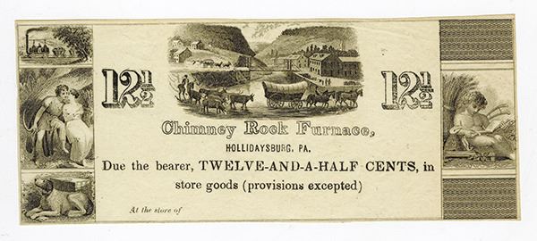 Hollidaysburg, PA., 12 1/2 cents, H 159-28, XF to AU condition, covered wagon pulled by horses in middle with bridge and town in background, allegorical figures including dog, train and reapers on counterfoils. Scarce note.