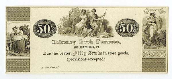 Hollidaysburg, PA., 50 cents, H 159-30, AU to Uncirculated condition with a small pin hole on the lower left corner edge, allegorical female figures on left and right with seated man and woman in middle, rare.