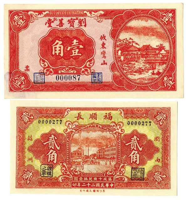 China, Lot of 2 notes, both from the same bank, includes 10 cents and 20 cents notes, both smaller format in either orange and light green or red, S/N's 000087 and 0000277. Both low numbers and possibly rare. Uncirculated. Scarce private scrip notes.