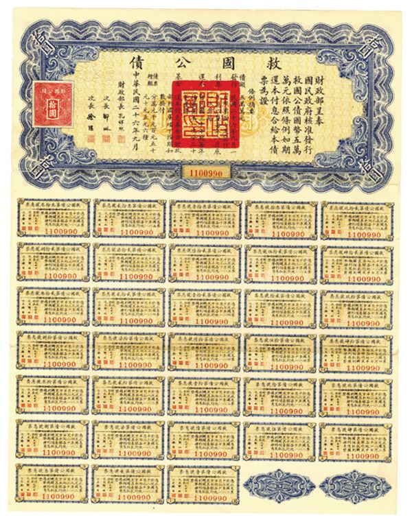 China, $10 Liberty Bond with 33 coupons, VF/XF condition. Black text with blue border and light peach undertint and large red seal in middle, revenue stamp at left. S/N 1100990, Attractive bond.