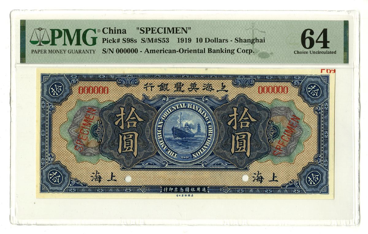 Shanghai, China, 1919. 10 Dollars, P-S98s S/M#S53, Specimen Banknote, Blue on m/c underprint with company title and logo at center of note, Back is blue with English text, S/N 000000, Specimen overprints and POCs, PMG graded Choice Uncirculated 64, ABNC.