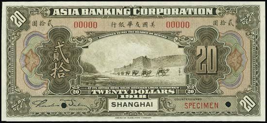 P-S114s2. Unlisted. 1918. $20. Shanghai Branch. Specimen banknote. Red specimen overprint, "00000" serial numbers and POC's. This bank was a subsidiary of Guarantee Trust Co. of New York, which was later absorbed by International Banking Corporation, a predecessor of CitiBank. Gem uncirculated condition. ABNC.