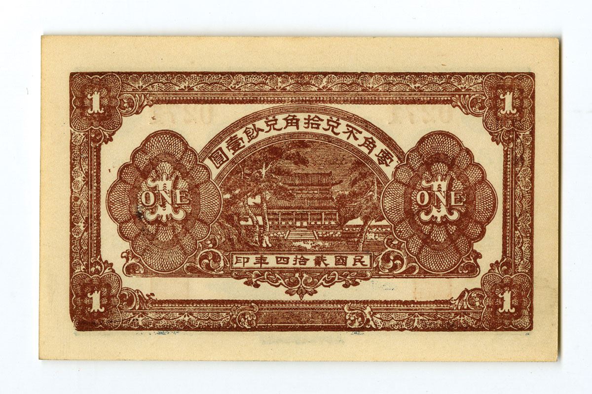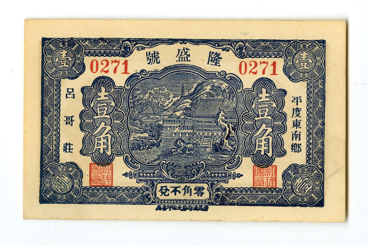 Pingdu, China, ca. 1930–1940s; 1 jiao private merchant note issued by ___ (Long Sheng Hao), with printed locality _____ (Pingdu Southeast Township) and traditional courtyard vignette; reverse printed in brown with decorative “ONE” counters and pavilion vignette. Condition: Choice Fine to VF or better.
