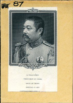 1917. P-37J to P-37N Unlisted. 2 different color vignette proofs, printed on india paper, with one mounted on manila card, of the same design. Vignette has portrait of Li Yuan-Hung, President of China. Colors are purple and black. The purple vignette has had a piece cut out of the top while the black vignette is intact. VG to choice condition. Rare vignettes from a rare banknote issue that was never released and only known in Proof and possibly specimen. Rare vignette. ABNC.