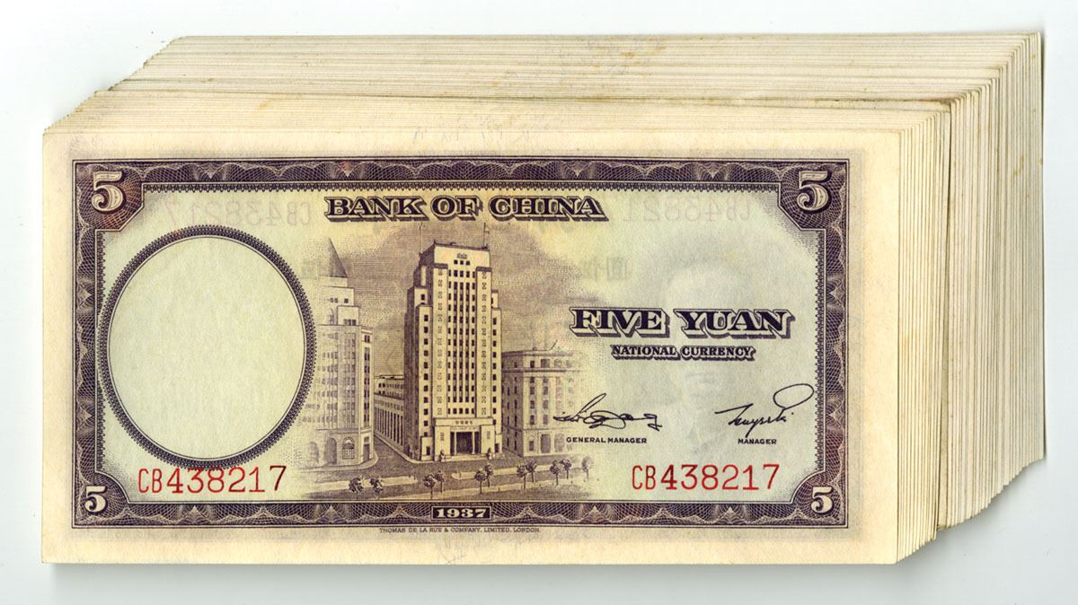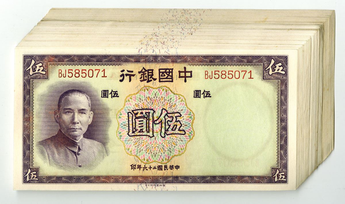 China....., 1937. 5 Yuan, P-80 (45), S/M#C294-221, Issued Banknote Assortment, Violet on m/c underprint with SYS at left, Back is purple on blue and m/c with skyscraper at center, A lot of notes are consecutive, Condition ranges from VF to XF. TDLR. (45). Sold "AS IS" no returns accepted.