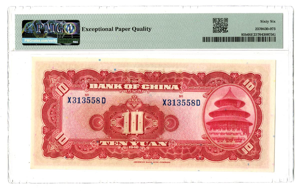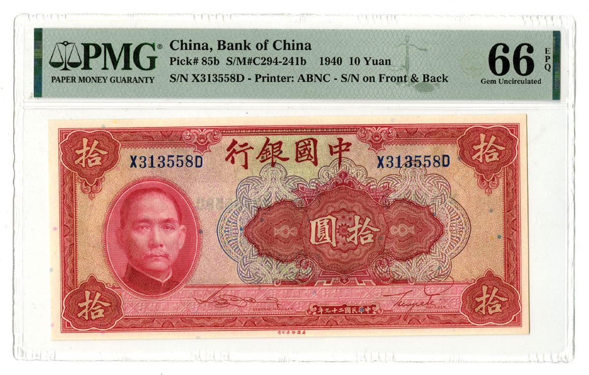 China, 1940. 10 Yuan, P-85b S/M#C294-241b, Issued Banknote, Red and gold on m/c underprint with SYS at left, Back is red with Temple of Heaven at right, S/N X313558D, PMG graded Choice Uncirculated, ABNC.