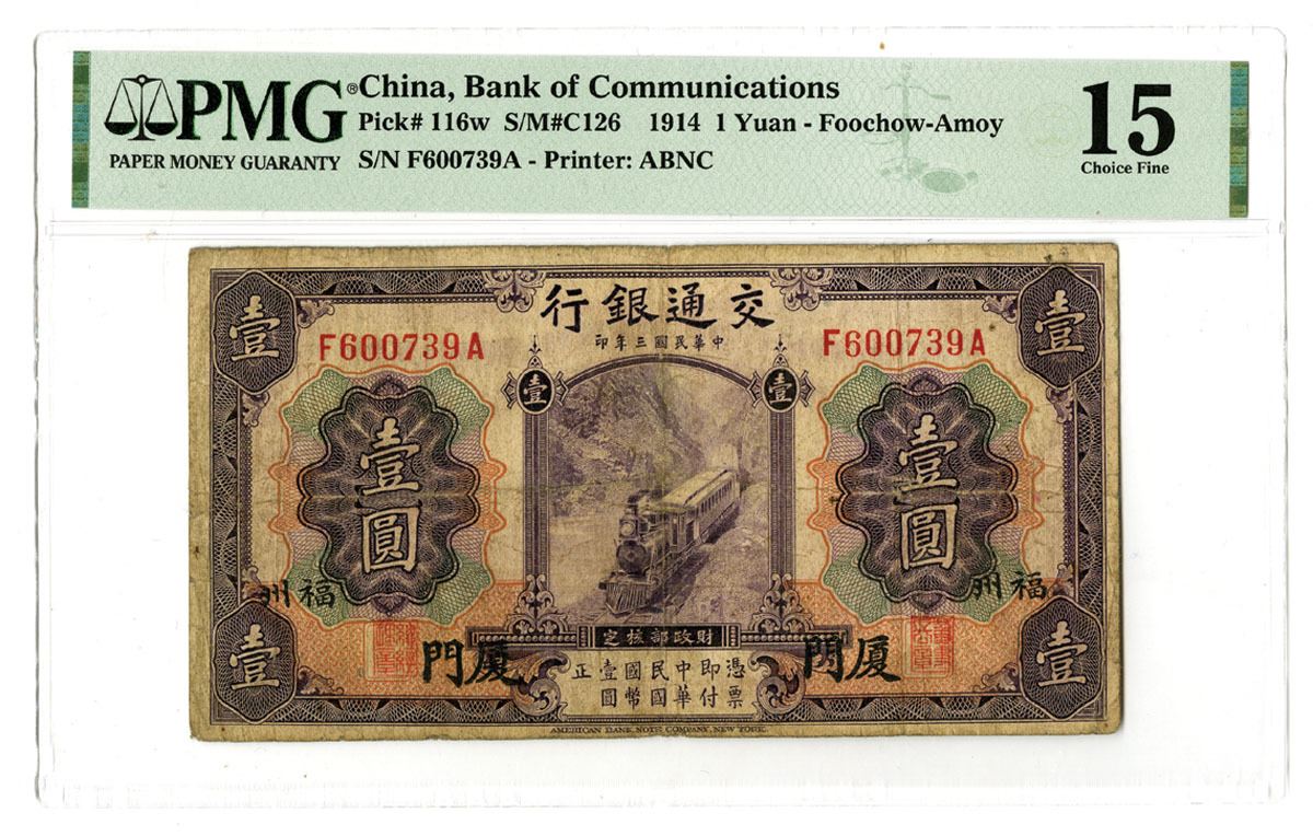 Foochow-Amoy, China, 1914. 1 Yuan, P-116w S/M#C126, Issued Banknote, Brown on m/c underprint with steam passenger train in ravine at center, Back is purple with sailing ship at center, S/N F600739A, PMG graded Choice Fine 15, ABNC. Only 4 examples of this note have been graded in the PMG census. There is no record of a previous auction appearances of this note and it is the first time we have offered this amazing item