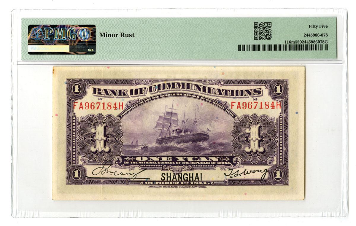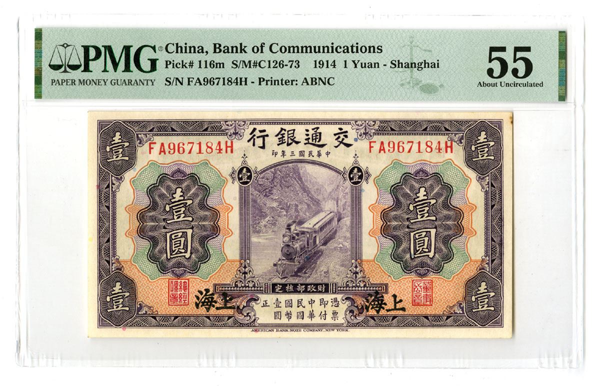 Shanghai, China, 1914. 1 Yuan, P-116m S/M#C126-73, Issued banknote, Purple on m/c underprint with train mountain gorge at center, Back is purple with ship on rough ocean at center, S/N FA967184H, PMG Graded About Uncirculated 55 with comment "Minor Rust," ABNC.