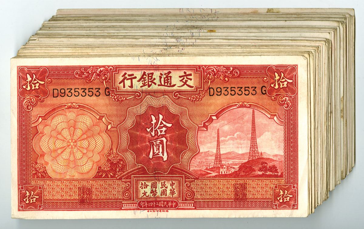 China, 1935. 10 Yuan, P-155 (69) S/M#C126-243, Issued Banknote Assortment, Red on yellow-orange underprint with high voltage electric towers at right, Back is red with pagoda on hill with shoreline at center, Notes range from VF to XF condition. TDLR. (69). Sold "AS IS" no returns accepted.