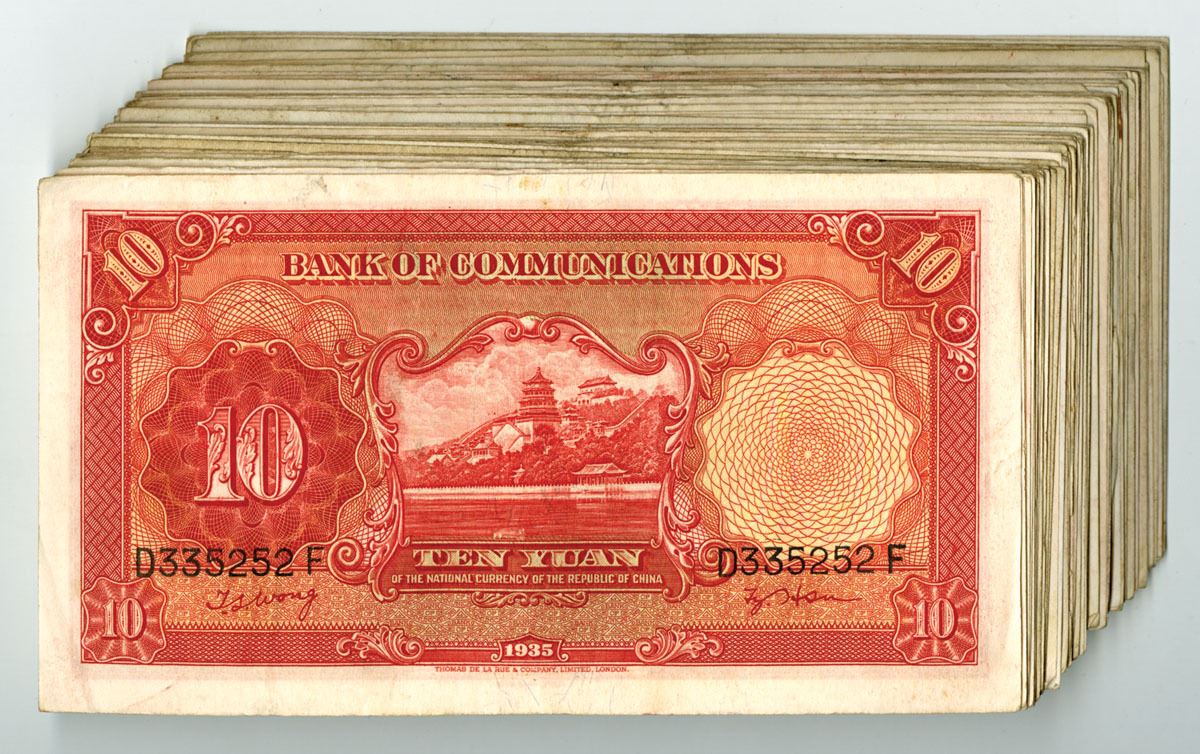China, 1935. 10 Yuan, P-155 (69) S/M#C126-243, Issued Banknote Assortment, Red on yellow-orange underprint with high voltage electric towers at right, Back is red with pagoda on hill with shoreline at center, Notes range from VF to XF condition. TDLR. (69). Sold "AS IS" no returns accepted.