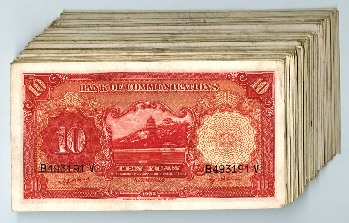China, 1935. 10 Yuan, P-155 (71) S/M#C126-243, Issued Banknote Assortment, Red on yellow-orange underprint with high voltage electric towers at right, Back is red with pagoda on hill with shoreline at center, Notes range from VF to XF condition. TDLR. (71). Sold "AS IS" no returns accepted.