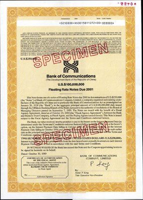 (The Development Bank of the Republic of China). 1989. U.S. $250,000. Specimen Floating Rate Notes Due 2001. Yellow border and undertint. Red specimen overprint. Coupons attached. 3 copies total. XF condition. SC-USBNC.