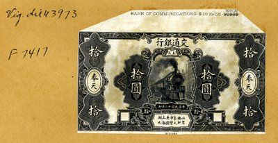 1923. P-133 TC Unlisted. $10 Trial Color face proof of 1923 issue (Fengtien Province). Printed in black on india paper and mounted on manila file folder (original was printed in purple). I am not positive on the catalog number of this note, so please inspect and evaluate carefully. Rare note and unique in archive. CV $550 in Unc. Fine to VF condition with some glue bleed through. ABNC.