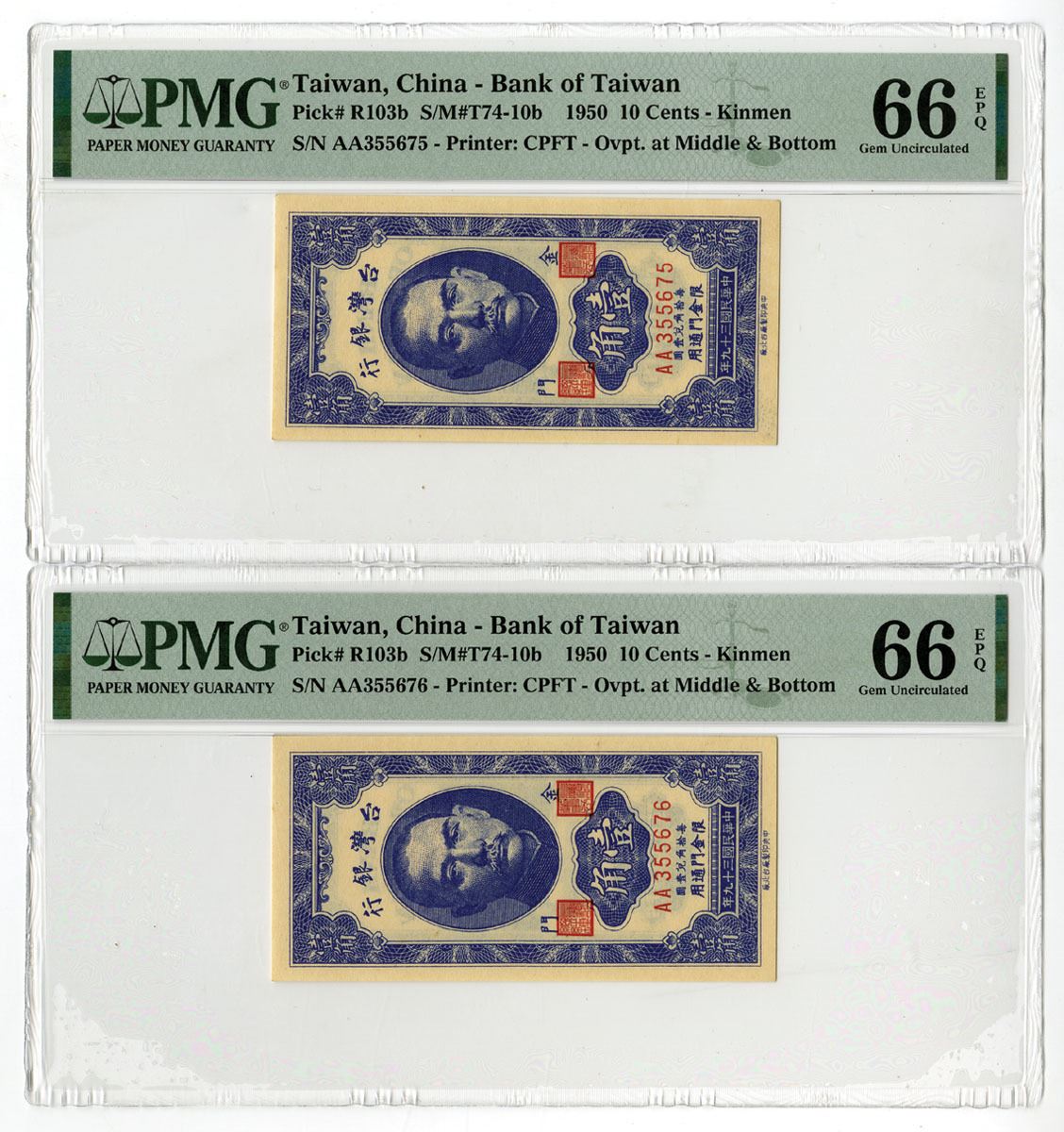Kinmen, Taiwan, China, 1950. 10 Cents, P-R103b (2) S/M#T74-10b, Lot of 2 Sequential Issued Banknotes, Blue printing in Horizontal format with SYS at top, Back is blue with bank building at center, S/Ns AA355675 and AA355676, Both notes are PMG graded Gem Uncirculated 66 EPQ, CPFT. (2). Sold "AS IS" no returns accepted.