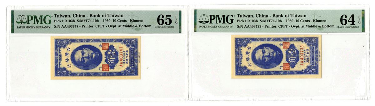 Kinmen, Taiwan, China, 1950. 10 Cents, P-R103b (2) S/M#T74-10b, Issued Banknote Pair, Blue printing in Horizontal format with SYS at top, Back is blue with bank building at center, S/Ns AA403733 & AA403747, Both are PMG graded, First is Choice Unc 64 EPQ and other is Gem Unc 64 EPQ. (2). Sold "AS IS" no returns accepted.