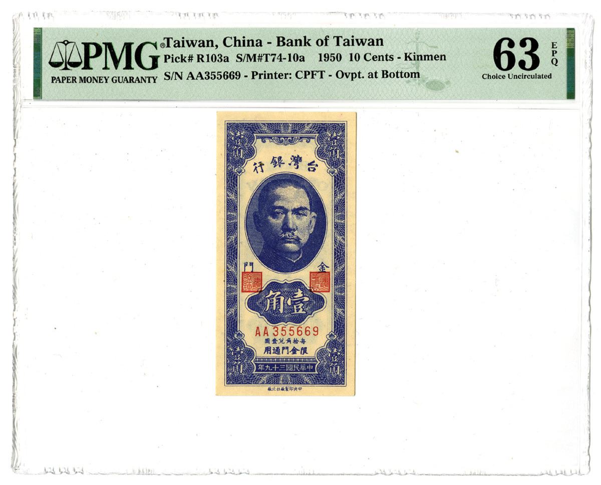 Kinmen, Taiwan, 1950. 10 Cents, P-R103a S/M#T74-10a, Issued Banknote, Blue print in Vertical format with SYS at center, Back is blue with building at center, S/N AA355669, PMG graded Choice Uncirculated 63 EPQ, CPFT. Only 6 notes grade 1 increment higher out of 471 graded in the PMG census.