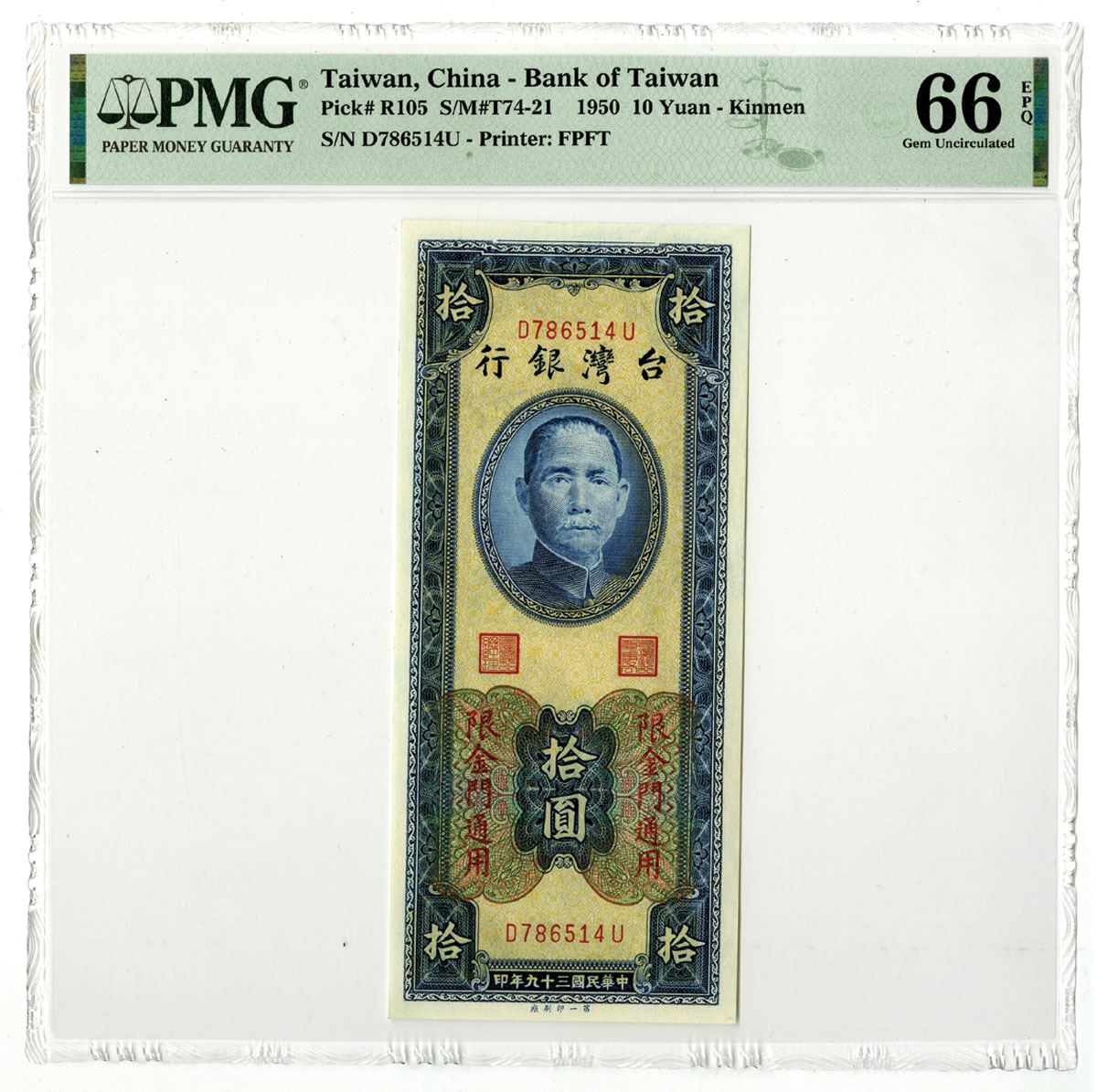 Kinmen, Taiwan, China, 1950. 10 Yuan, P-R105 S/M#T74-21, Issued Banknote, Blue on m/c underprint in Horizontal format with SYS at top, S/N D786514U, PMG graded Gem Uncirculated 66 EPQ, FPFT.