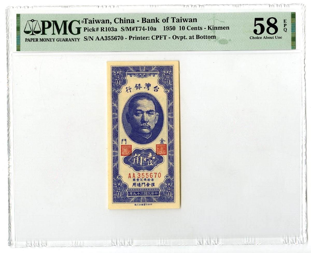 Kinmen, Taiwan, China, 1950. 10 Cents, P-R103a S/M#T74-10a, Issued Banknote, Blue printing in Horizontal format with SYS at top, Back is blue with bank building at center, S/N AA355670, PMG graded Choice About Uncirculated 58 EPQ. CPFT.