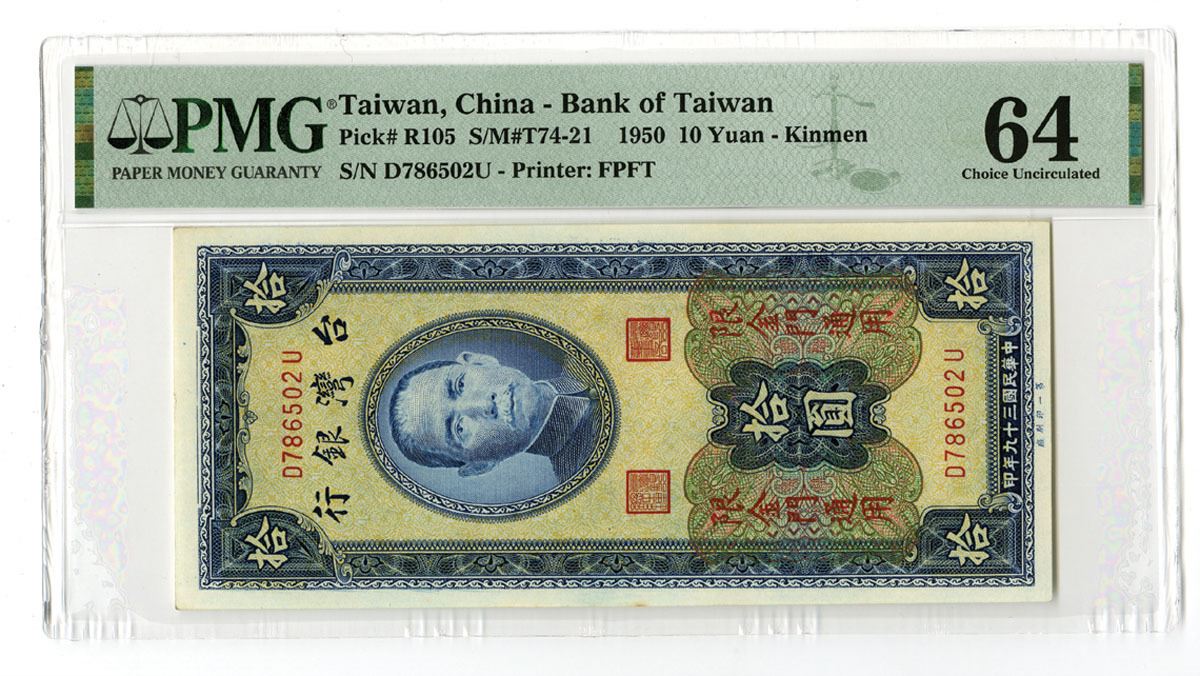 Kinmen, Taiwan, China, 1950. 10 Yuan, P-R105 S/M#T74-21, Issued Banknote, Blue on m/c underprint in Horizontal format with SYS at top, S/N D786502U, PMG graded Choice Uncirculated 64, FPFT.